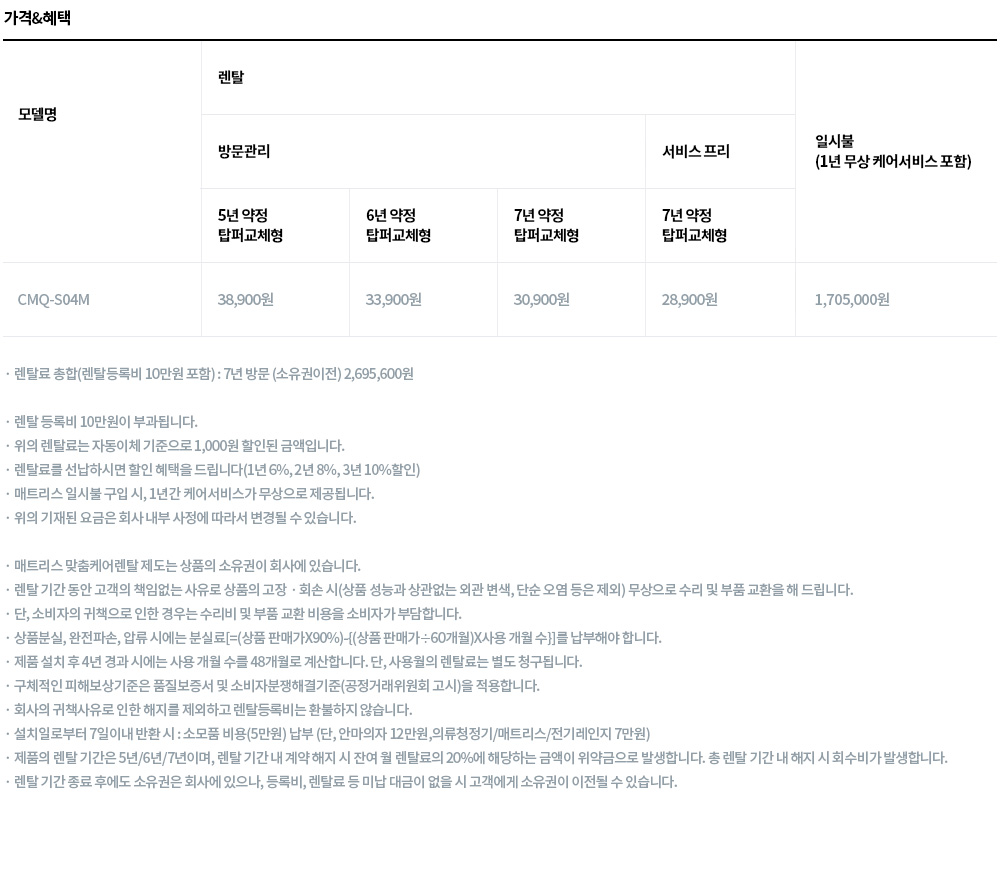 CMQ-S04M 탑퍼교체 매트리스 프라임 플러스(일반형) 퀸 렌탈 자가관리 3년약정 하얀색 농협카드